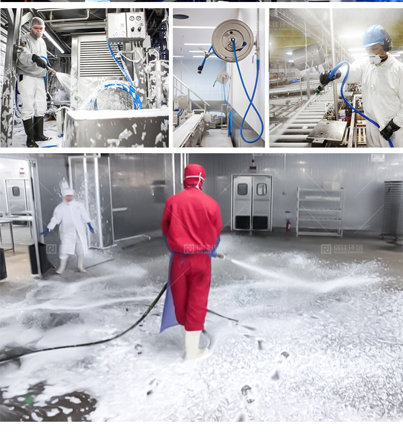 • 食品加工企业在产品生产过程中,加工设备及管道的清洗非常重要。加工设备及管道在使用后会产生一些沉积物,如不及时、彻底地清洗,将直接会影响产品的质量。确保地面及设备表面卫