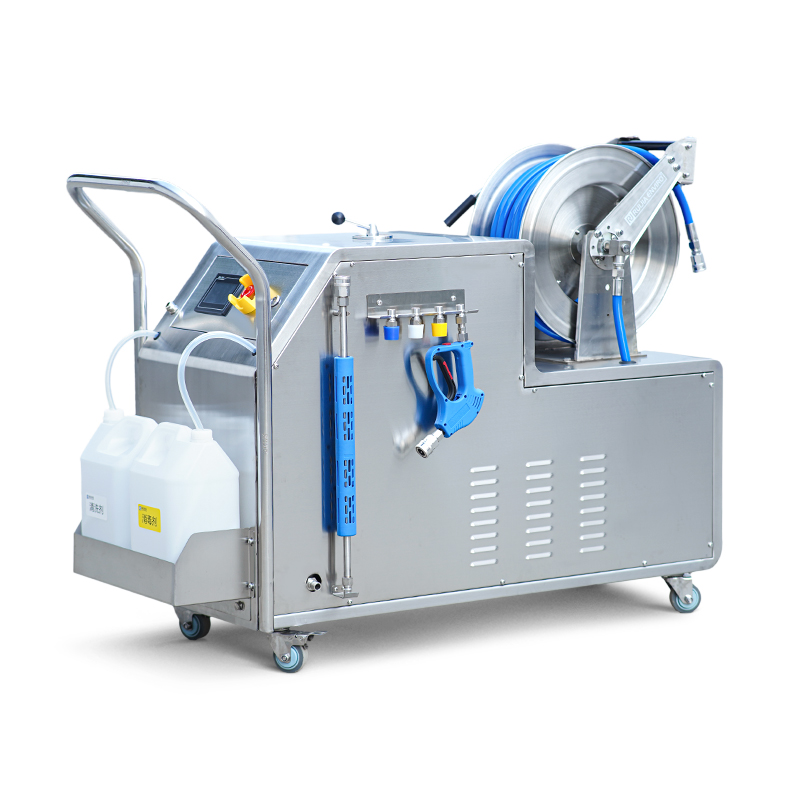 泡沫清洗的方法是将泡沫母液按比例添加到高压水中,溶液在混合器内被压缩空气充分混合后使其发泡,然后将发泡后的清洗液通过出口软管及喷枪喷洒在被洗物的表面,清